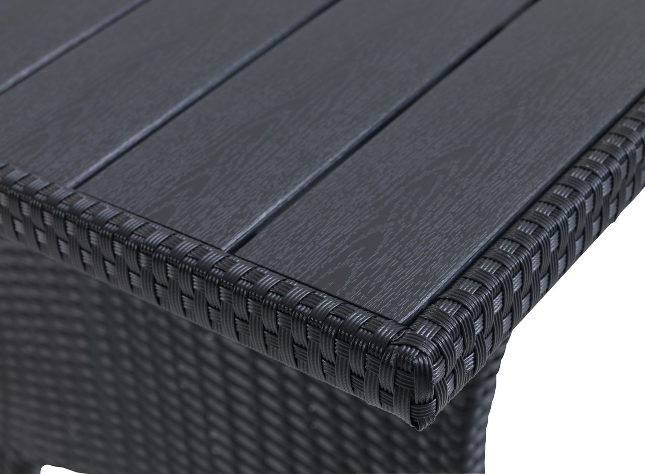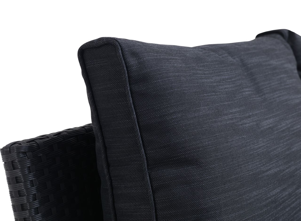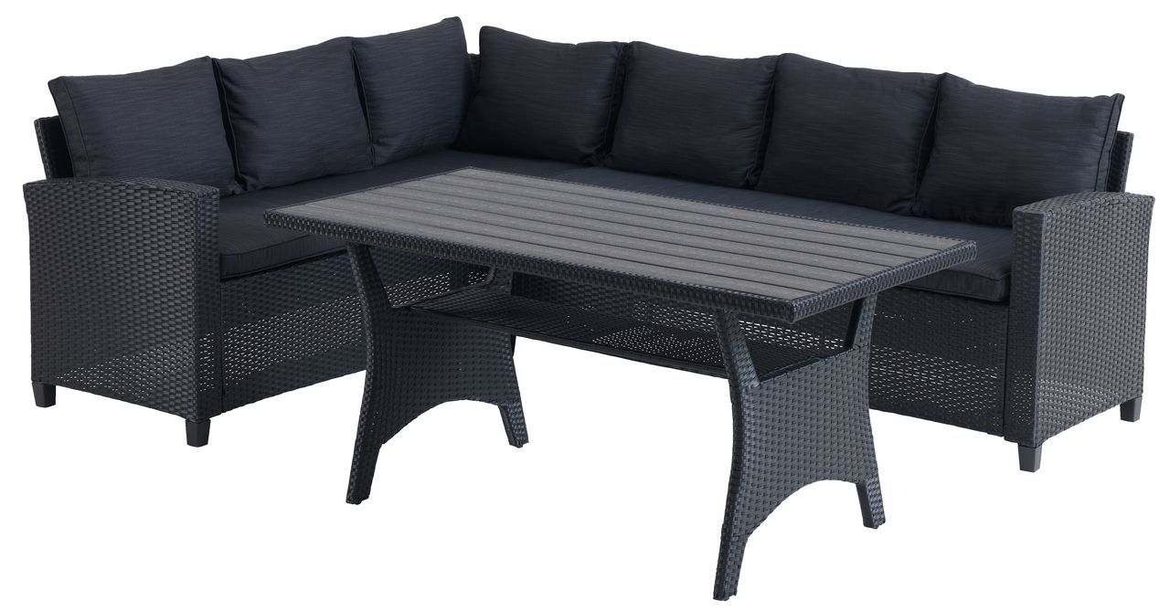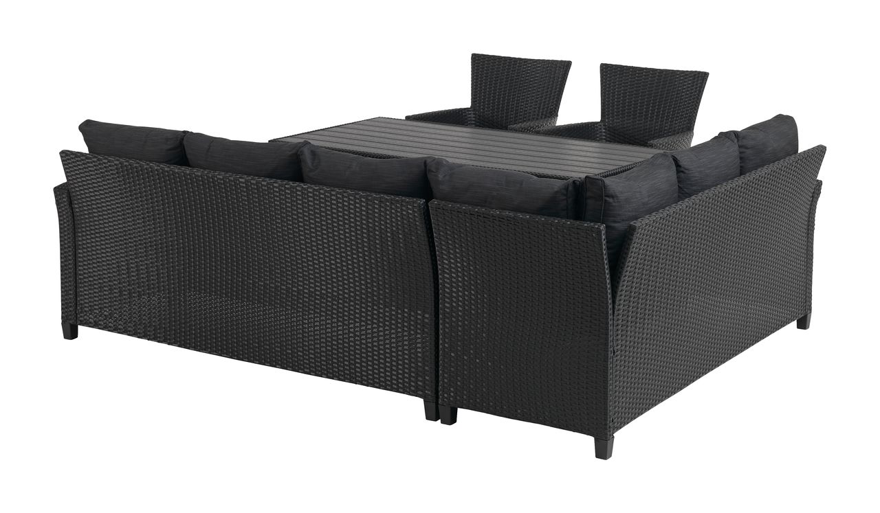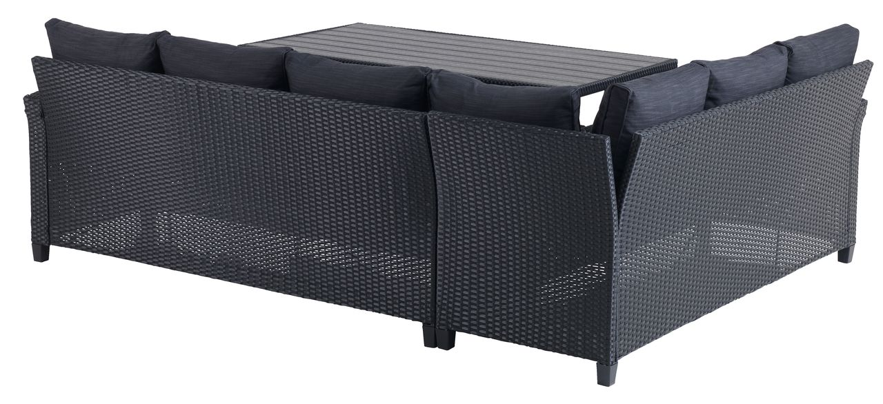 Sto: čelik, vještačko drvo i petan. Š74xD144xV67 cm. Ugao garnitura za 6 osoba: čelik i petan. Fiksni ugao. Sa luksuznim jastucima sa dugotrajnom, grubo tkanom navlakom.
