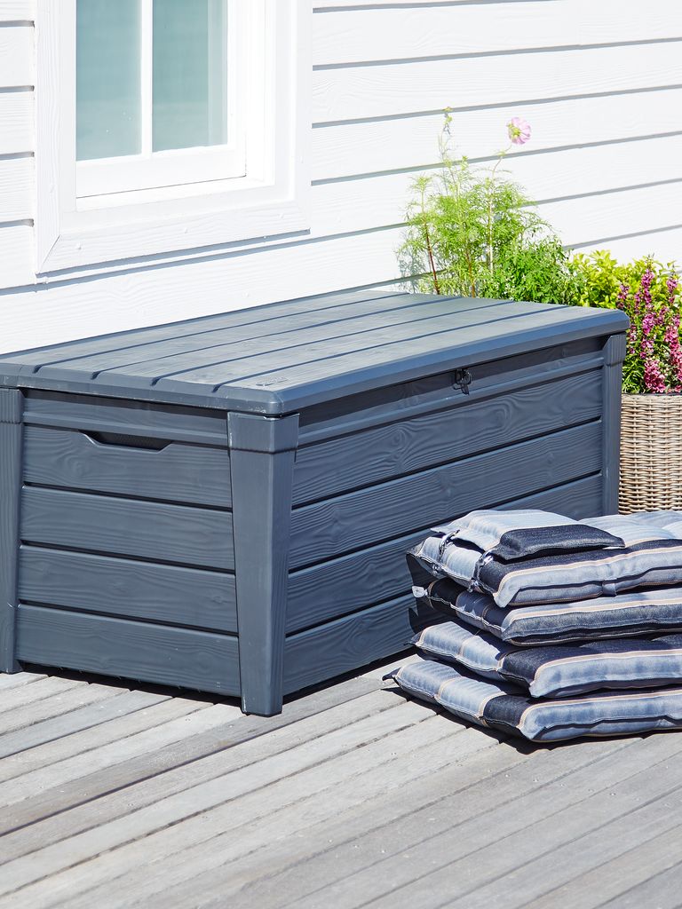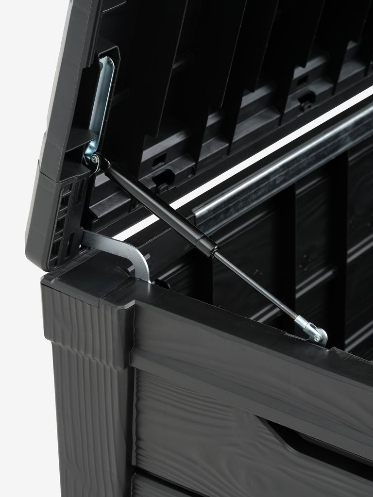 Vodootporna plastika sa UV-zaštitom (60% reciklirana). Sa praktičnim hidrauličnim poklopcem i ručkom za otvaranje. Može da se koristi i kao klupa. Otporan na smrzavanje. Š145xV60xDub69 cm