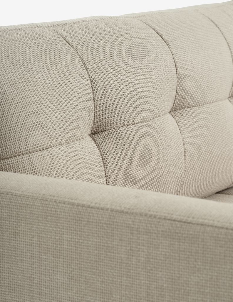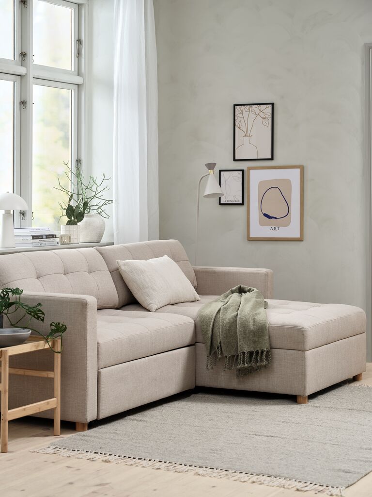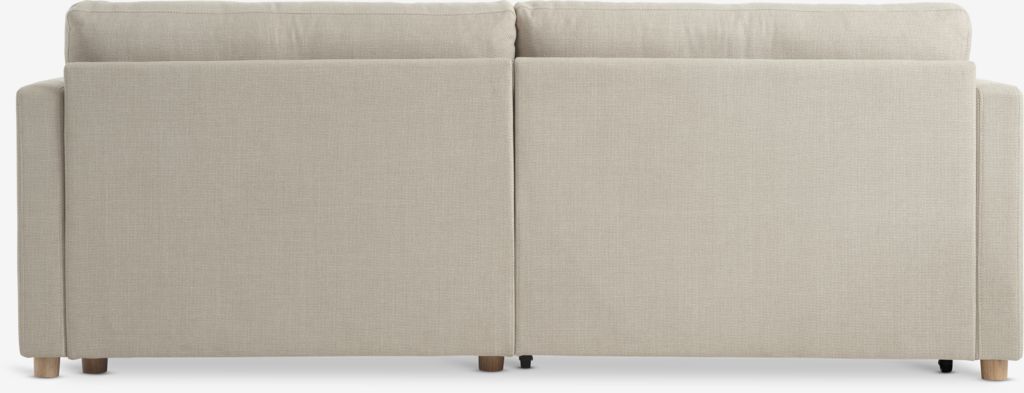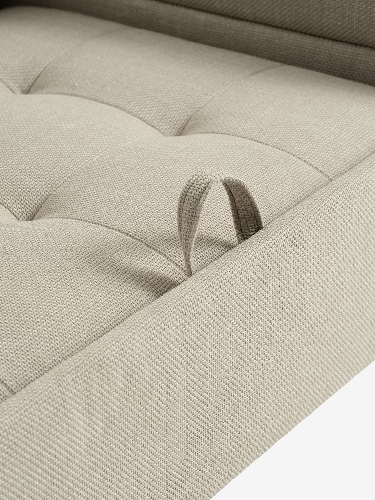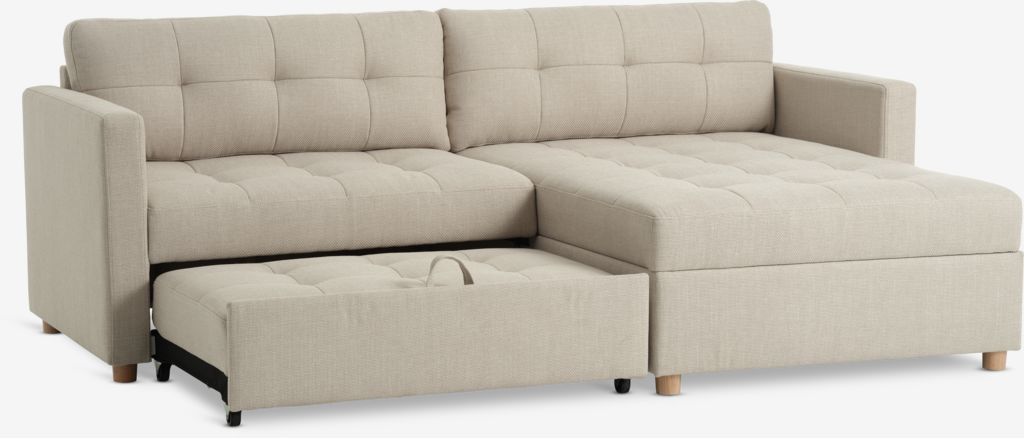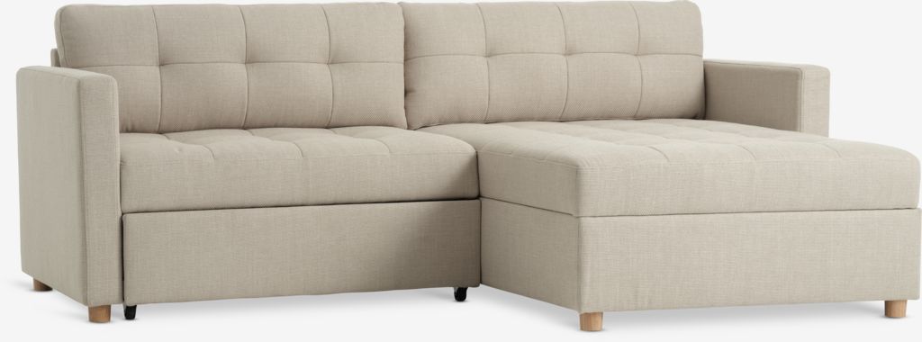Garnitura od tkanine. Lako se razvlači u krevet. Sedište sa džepičastim oprugama i punjenjem od pene. Naslon od pene. Sa prostorom za odlaganje. Levi ili desni ugaoni deo. Noge od masivnog drveta. Površina za spavanje: 140x200 cm. Š220xV83xDub84/150 cm