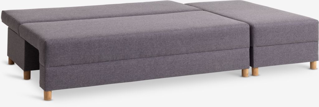 Trosjed od tkanine sa lijenjivcem. Lako se razvlači u krevet. Sjedište i naslon od pjene. Sa prostorom za odlaganje. Lijevi ili desni ugaoni dio. Površina za spavanje: 130x213 cm. Š214xV69xDub81/122 cm