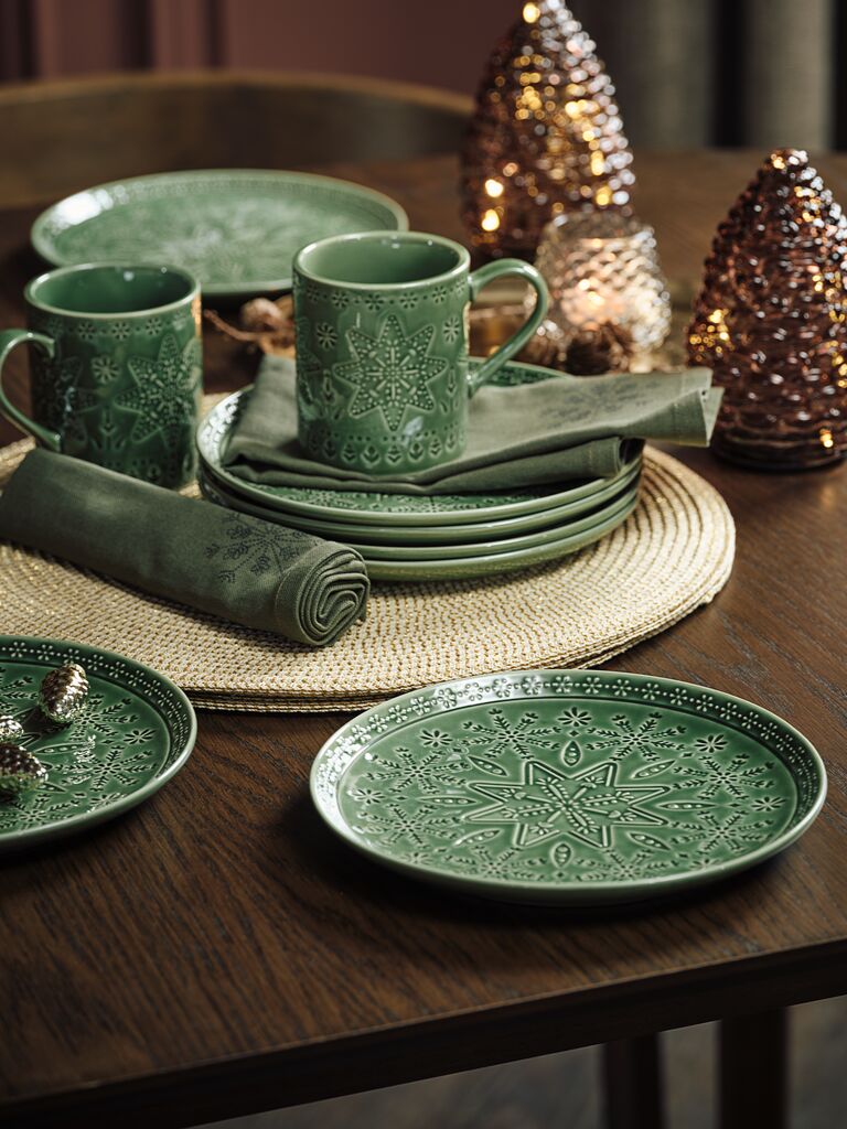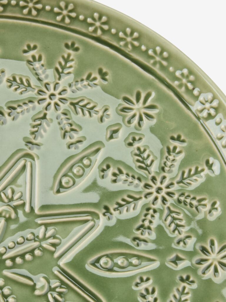 Zeleni tanjir od sjajnog porcelana sa rustičnim dizajnom i prazničnim dezenom. Koristite ga na prazničnoj trpezi kada služite deserte ili sitna predjela. Ø20xV2 cm