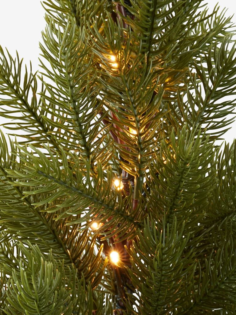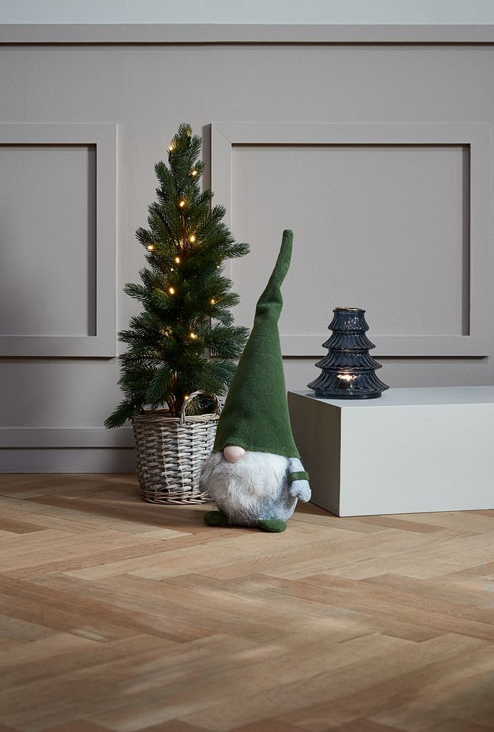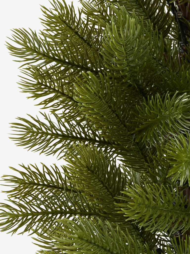 Vještačko novogodišnja jelka u vojničko zelenoj boji sa ugrađenom LED rasvjetom. Jelka dolazi u prelijepoj sivoj korpi od ratana, što joj daje dodatnu eleganciju. Opremljena je sa 30 LED sijalica koje emituju toplo, prijatno svijetlo (2700 K). Ukupna dužina lampica je 1,75 m, sa rastojanjem između sijalica/lampica od 5 cm. Jelka je idealna za dekoraciju unutrašnjih i spoljašnjih prostora. Vrijeme gorenja LED sijalica je 10000 sati. Potrebne su 2 AA baterije (nisu uključene). Š28xD75x28xV75 cm