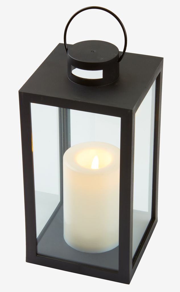 Crni fenjer od stakla i plastike sa LED sijalicom koja emituje svjetlost od 3100 K. Fenjer ima ugrađen tajmer i koristi dve AA baterije (nisu uključene). Modernog je dizajna i pogodan za dekoraciju u unutrašnjim i spoljašnjim prostorima. Š13xD13xV27 cm
