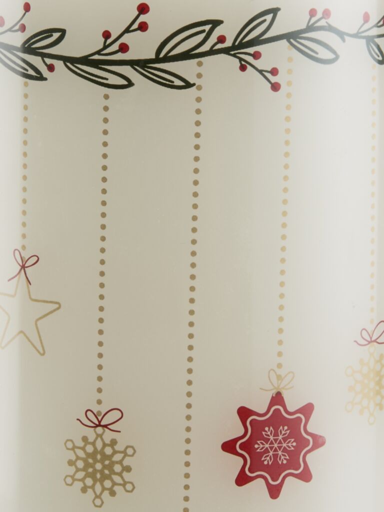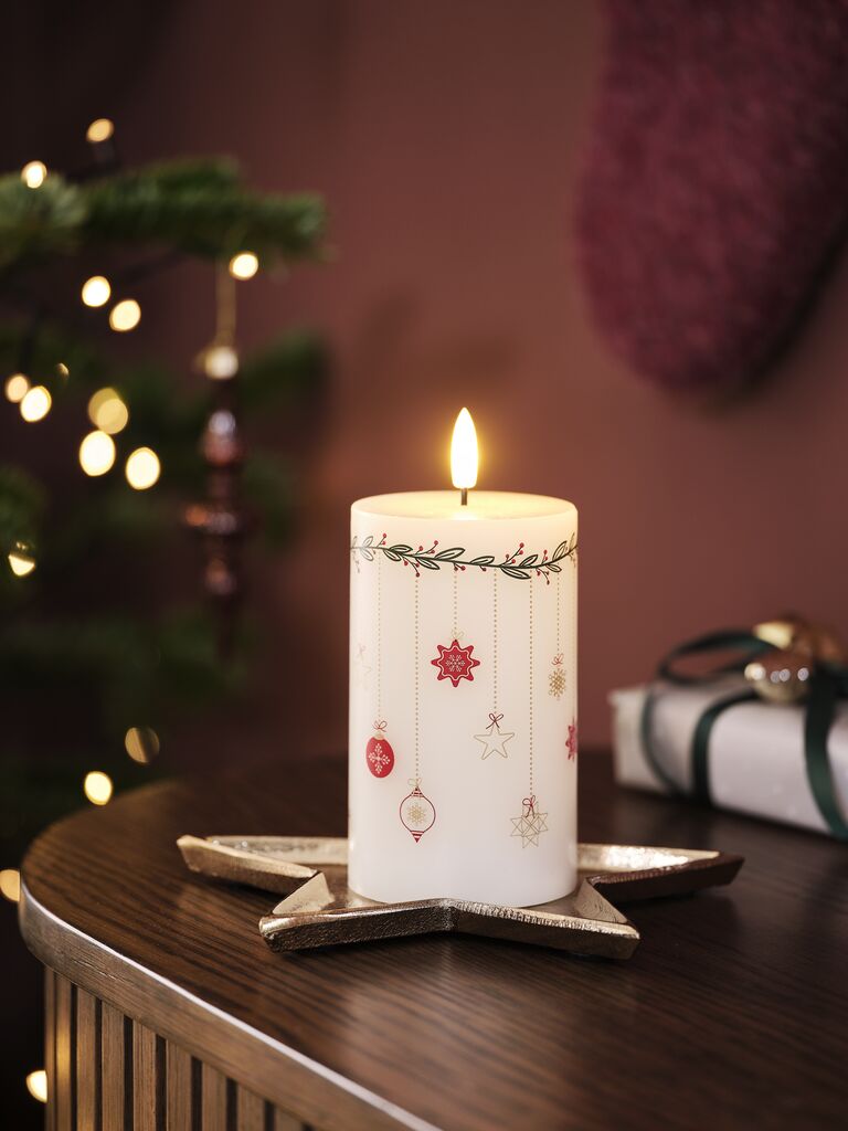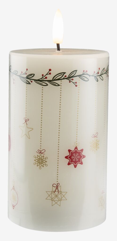 Bela LED sveća napravljena od pravog voska i ukrašena jednostavnim božićnim elementima. Idealna za domaću božićnu dekoraciju ili za božićni sto. Potrebne su 2 AA baterije (nisu uključene). D13 x Ø8 cm