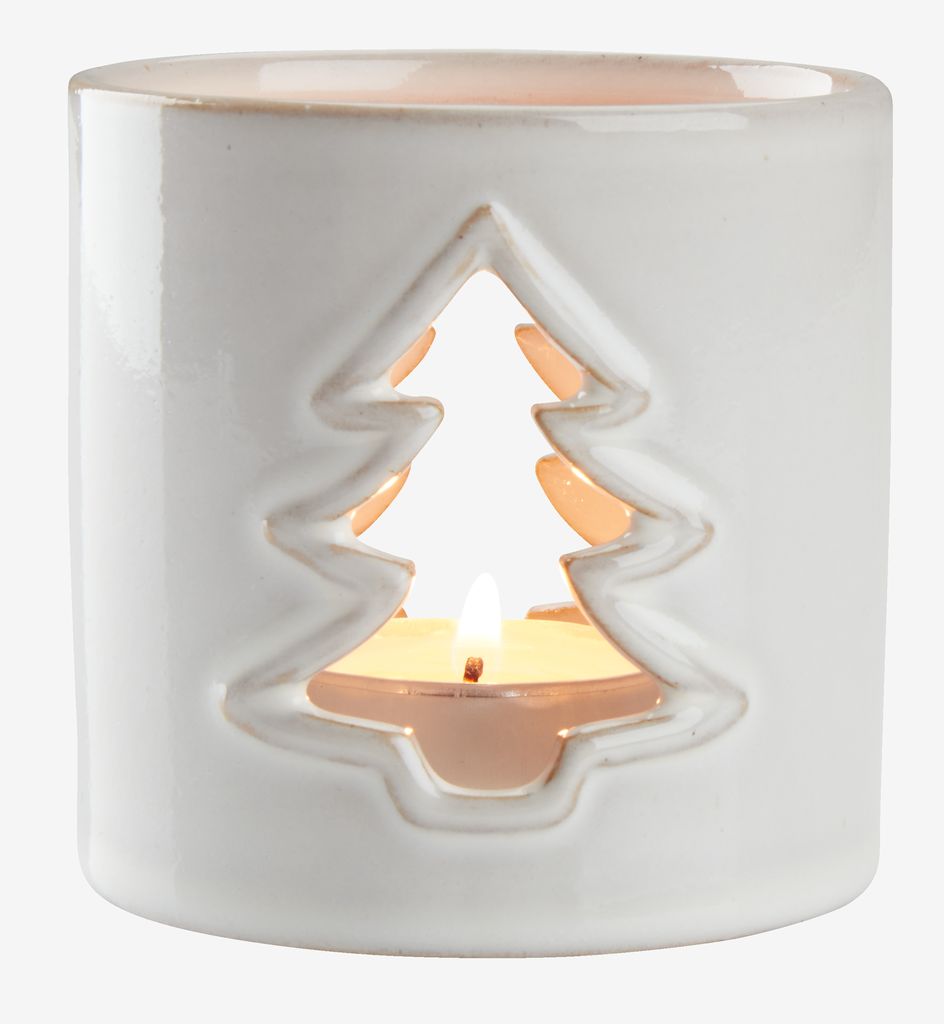 Bijeli svijećnjak za male svijeće napravljen od kamenine. Svijećnjak ima izrezbarene oblike zvijezde i novogodišnje jelke koji omogućavaju svjetlosti da prolazi i stvara prijatnu atmosferu. Ovi elegantni svijećnjaci su idealni za praznični dekor i dostupni su u različitim dizajnima. Ø8xV8 cm.