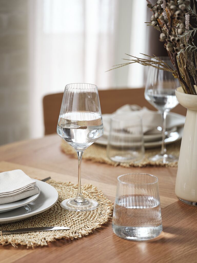 Čaša za vino modernog, uglastog oblika. Sud čaše ima suptilan rebrasti detalj za elegantan izgled. Ovaj bezbojni set od dve čaše može da se pere u mašini za pranje sudova, što olakšava održavanje. Ø8xV24 cm