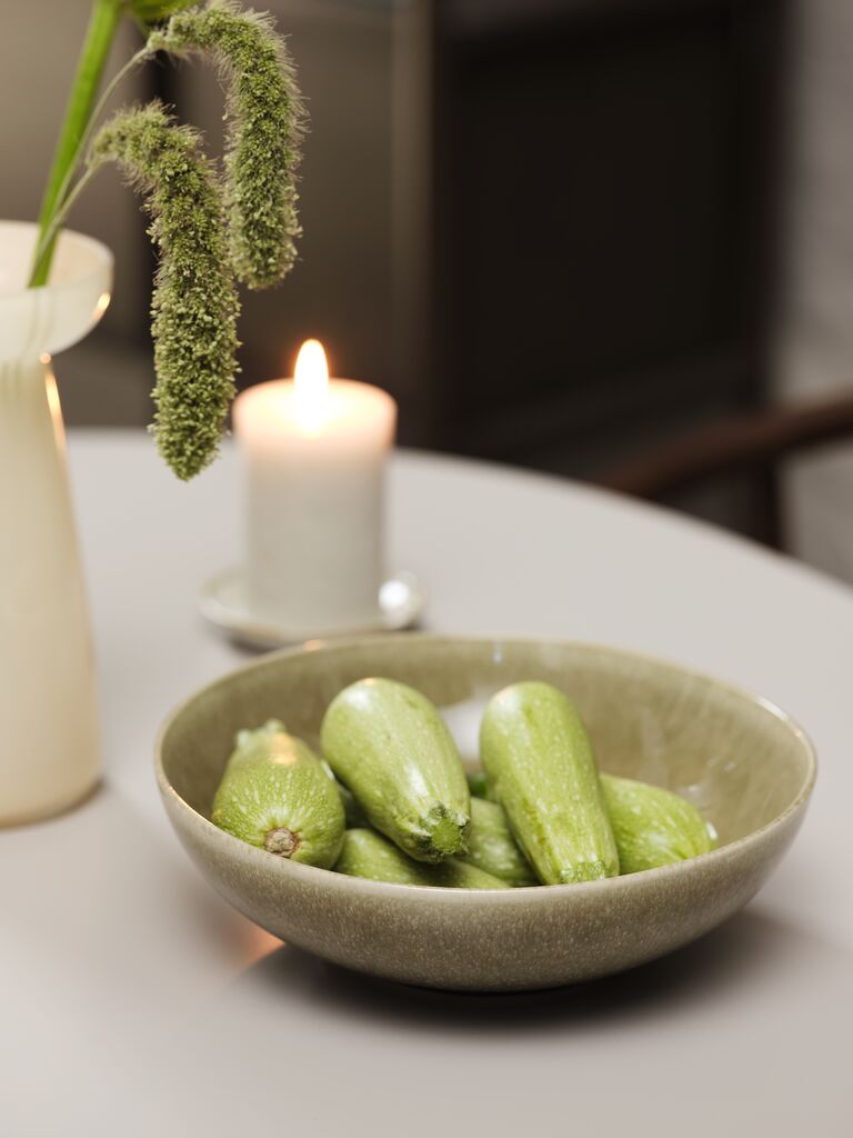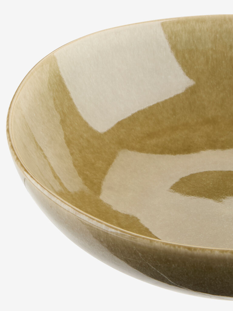 Svetlozelena činija od zemljane gline prostranog dizajna, idealna za serviranje salata ili izlaganje voća. Činija može da se pere u mašini za pranje suđa. Ø24xV7 cm