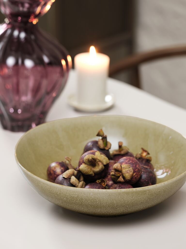 Činija od svetlozelene zemljane gline, prostranog dizajna, idealna za serviranje salata ili izlaganje voća. Činija može da se pere u mašini za pranje suđa. Ø30xV9 cm