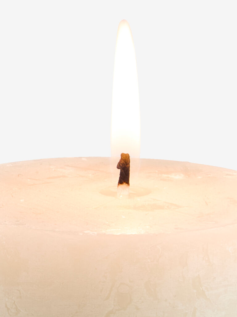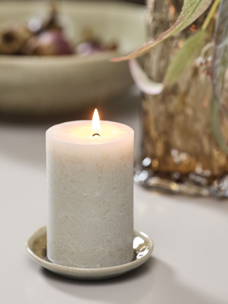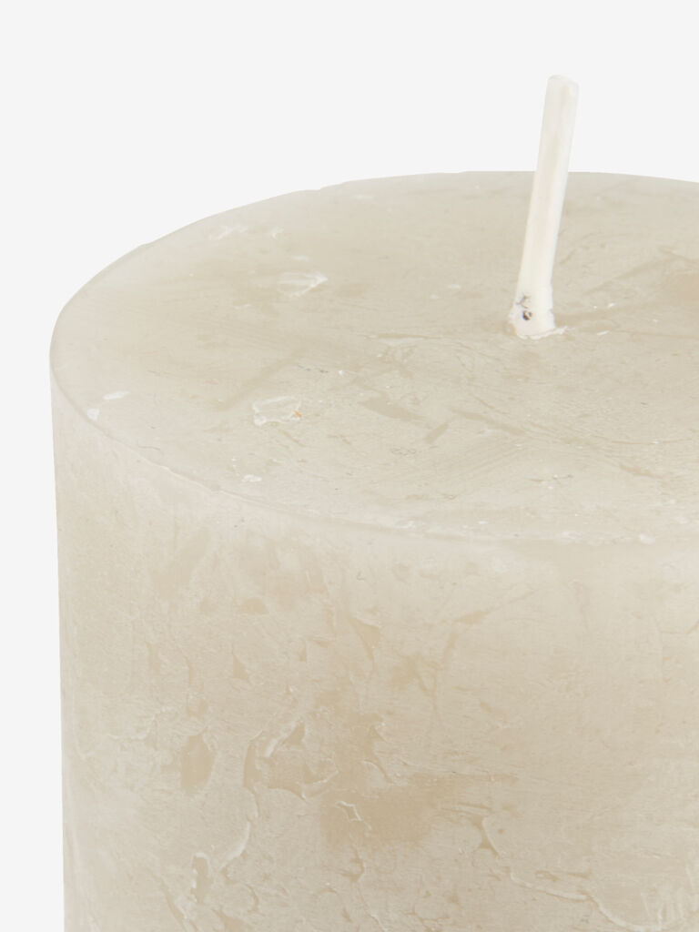 Sveća sa rustičnom, teksturiranom površinom u prirodnoj boji. Idealna za stvaranje tople, prijatne atmosfere, bilo da se koristi sama ili u grupi sa drugim svećama za kreiranje elegantnog aranžmana. Ø7xV10 cm
