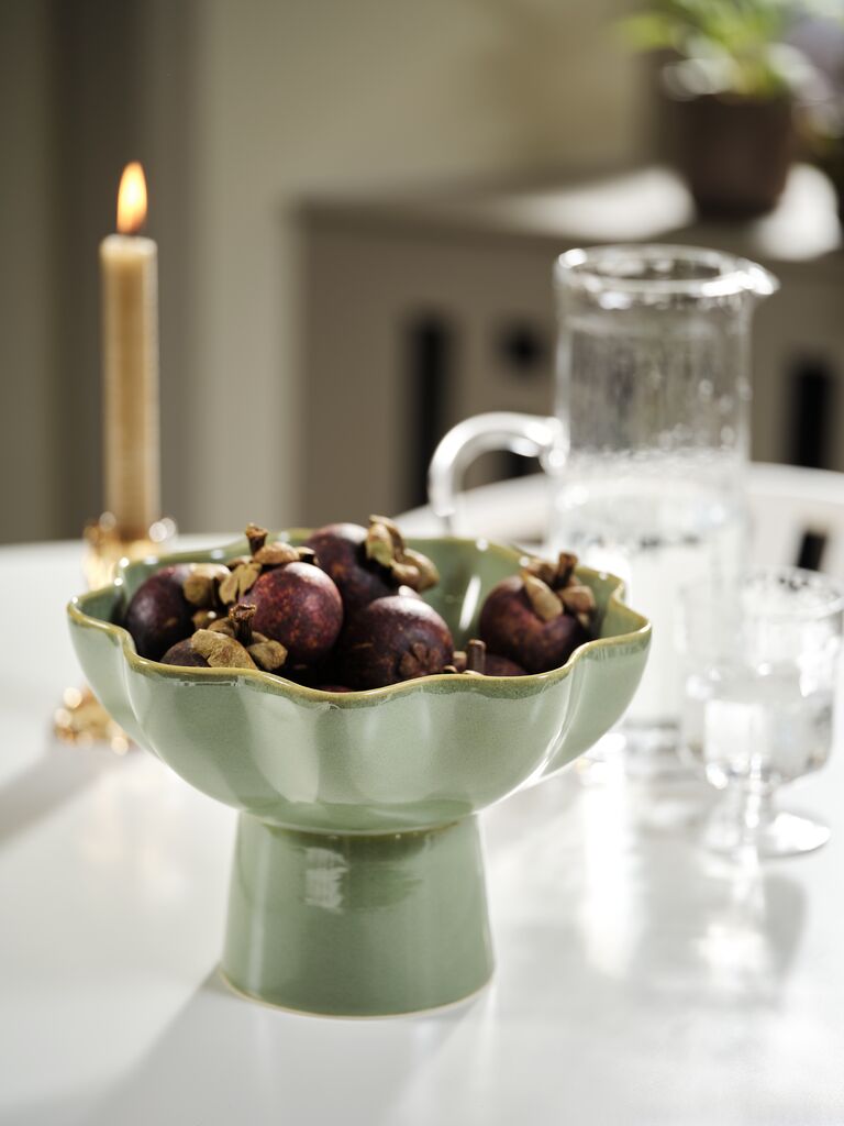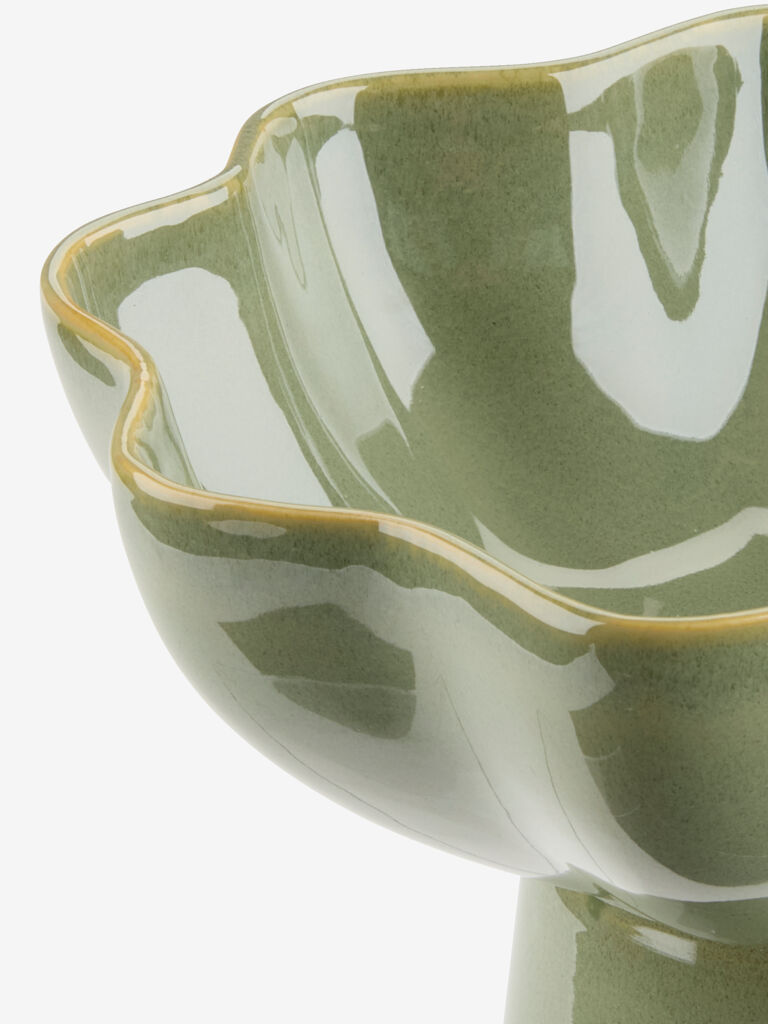 Ukrasna činija od kamenine u boji zelene jabuke sa prepoznatljivim talasastim rubom. Postolje je čini idealnom kao centralni ukras za izlaganje ukrasa ili posluživanje grickalica. Može se prati u mašini za pranje sudova radi lakšeg održavanja. Ø23xV15 cm