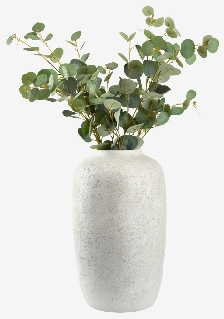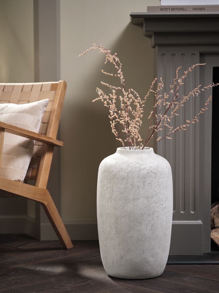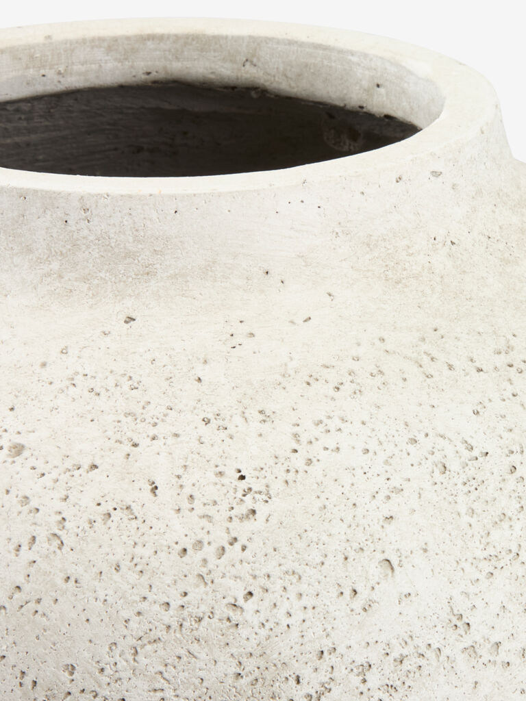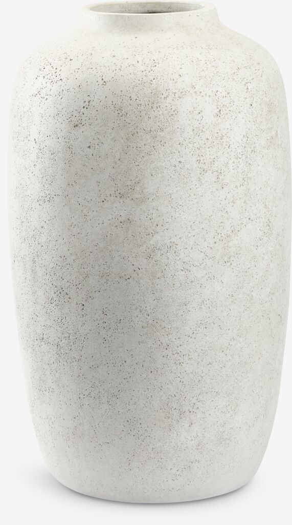 Vaza od svetlo sive vlaknaste gline sa sirovom, teksturiranom završnom obradom. Veliki, jednostavan dizajn je čini idealnom za izlaganje velikih buketa ili grana. Takođe može stajati samostalno kao dekorativni predmet, na primer na podu. Ø30xV51 cm
