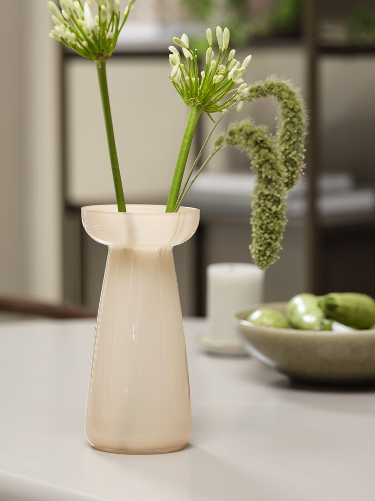 Vaza od glatkog stakla modernog oblika i tople boje vanile. Njen skulpturalni dizajn je čini idealnom za izlaganje buketa ili kao samostalni dekorativni predmet. Ø11xV22 cm