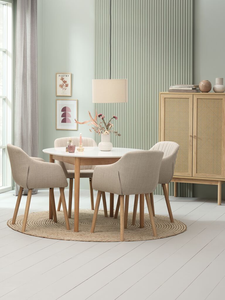 Masivno drvo i ukrasni furnir. Ø110xV75 cm. Sa 2 dodatna krila. Veličina produženog stola Š110xD200xV75 cm