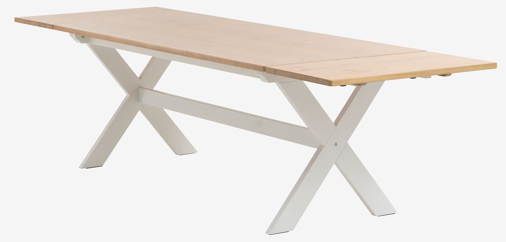 Trpezarijski sto sa mogućnošću dodavanja dodatnih krila za produžavanje. Ploča stola od masivne borovine, lakirana za dugotrajnost. Bijele noge od masivne borovine. Dodavanjem produžetaka možete lako da produžite sto na 235 ili 280 cm za više ljudi. Dodatna krila mogu odvojeno da se kupe. Š90xD190xV75 cm